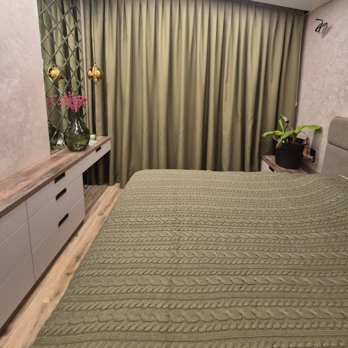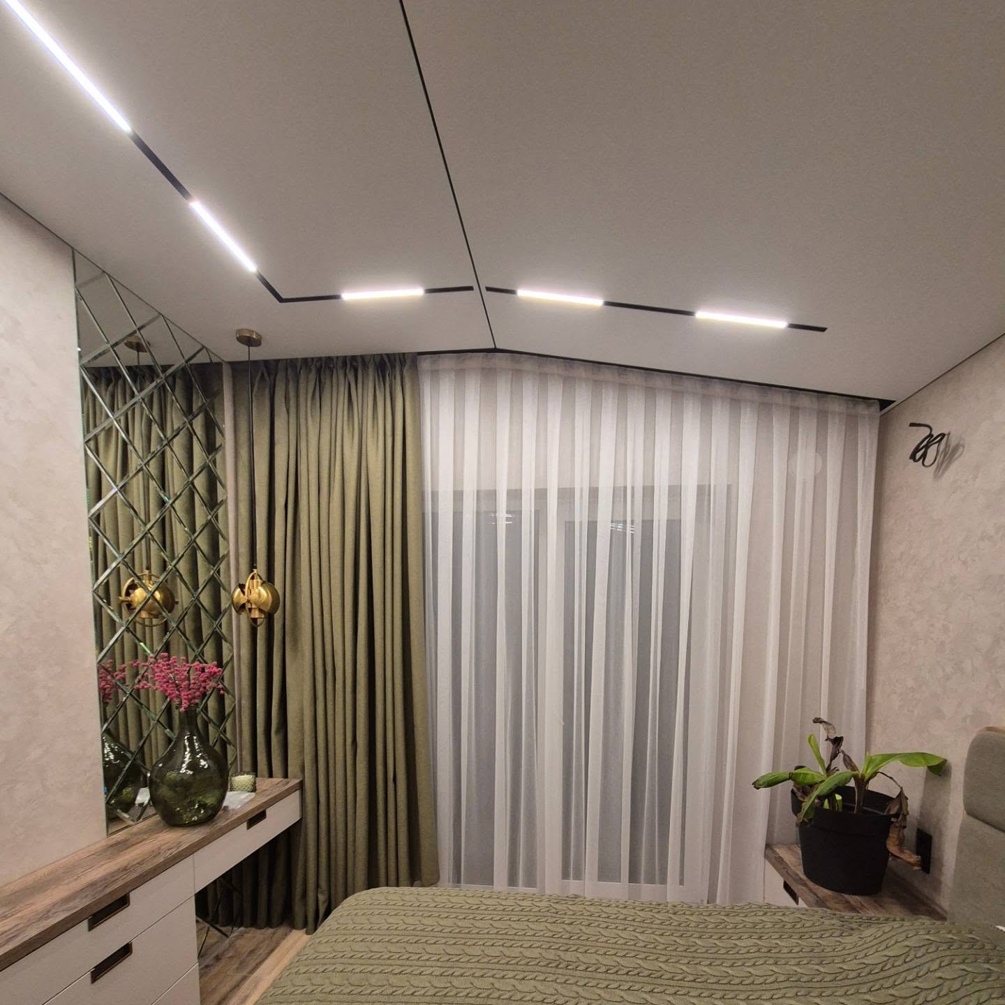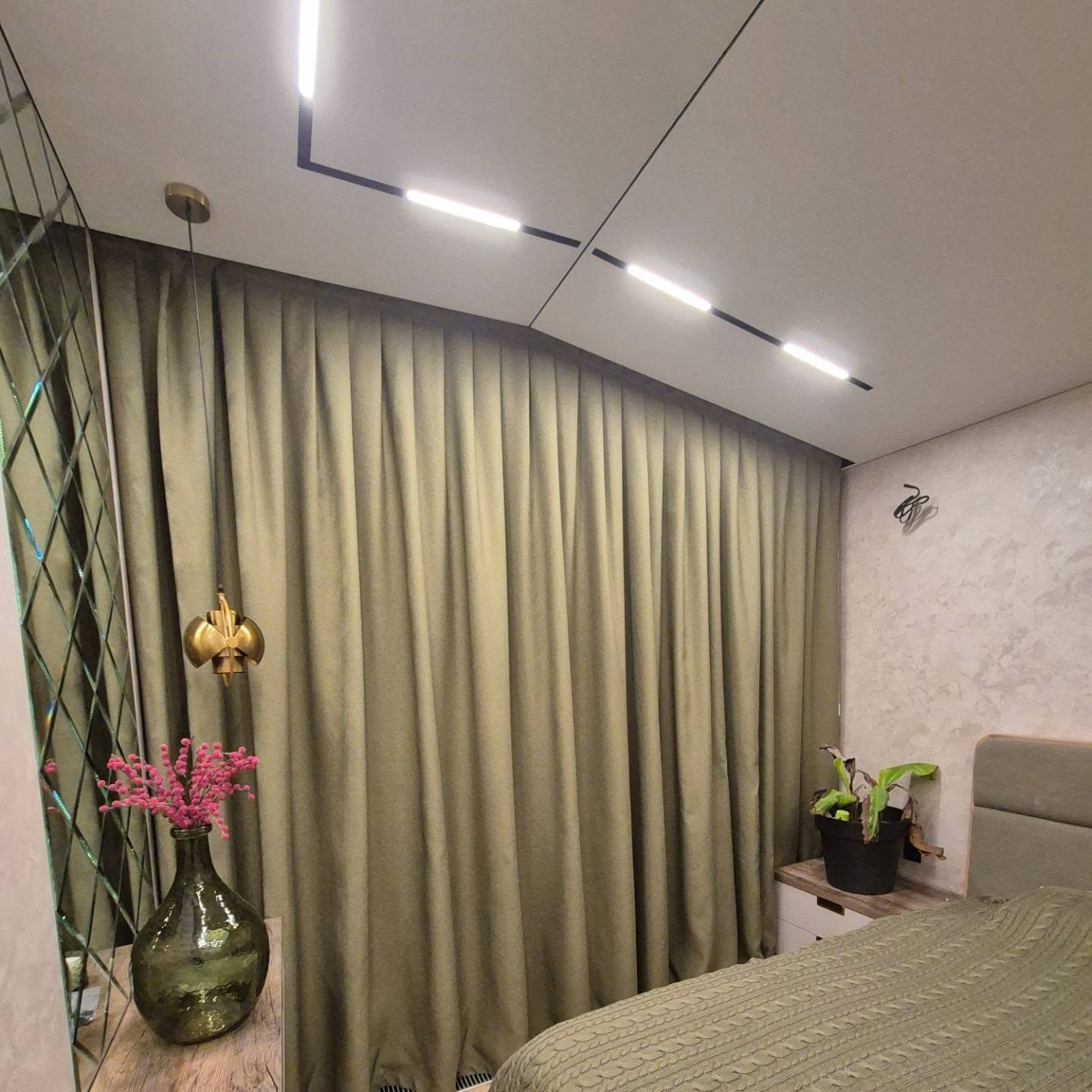 Дуже затишна спальня в зелених тонах) Цього року нам дісталося багато скошених карнизів, які ми із задоволенням прикрашаємо нашими шторами💚💚💚💚💚