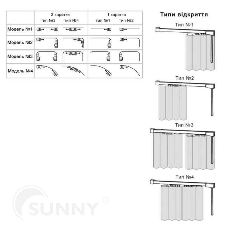 Можливі різні типи розсування штор: Типи розсування 1, 2, 3, 4 у прайсі.