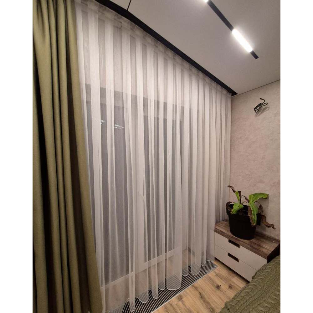 Комбінація білих тюлевих гардин і оливкових портьєр для спальні